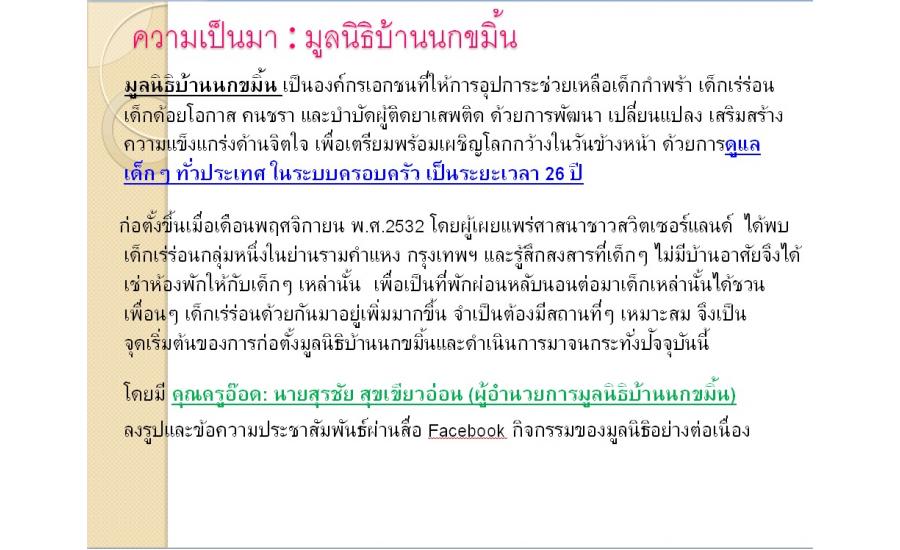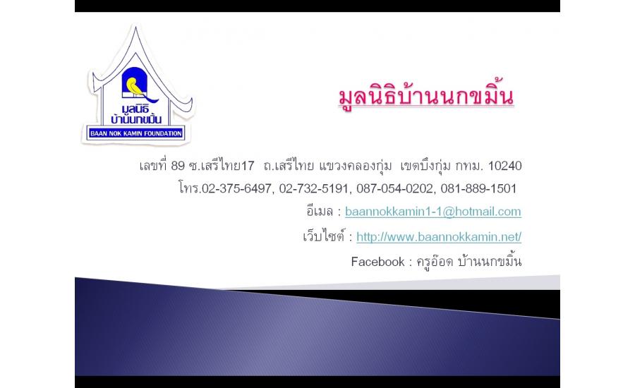 มูลนิธิบ้านนกขมิ้น เป็นบ้านหลังใหม่ของเด็กกำพร้า เด็กเร่ร่อน เด็กด้อยโอกาส ให้การช่วยเหลือด้วยความรักจากรูปแบบการดูแล "ระบบครอบครัว" มูลนิธิบ้านนกขมิ้นเป็นองค์กรเอกชนที่ให้การอุปการะช่วยเหลือเด็กกำพร้า เด็กเร่ร่อน เด็กด้อยโอกาส คนชรา และบำบัดผู้ติดยาเสพติด ด้วยการพัฒนา เปลี่ยนแปลง เสริมสร้างความแข็งแกร่งด้านจิตใจ เพื่อเตรียมพร้อมเผชิญโลกกว้างในวันข้างหน้า ด้วยการดูแลเด็กๆ ในระบบครอบครัว
