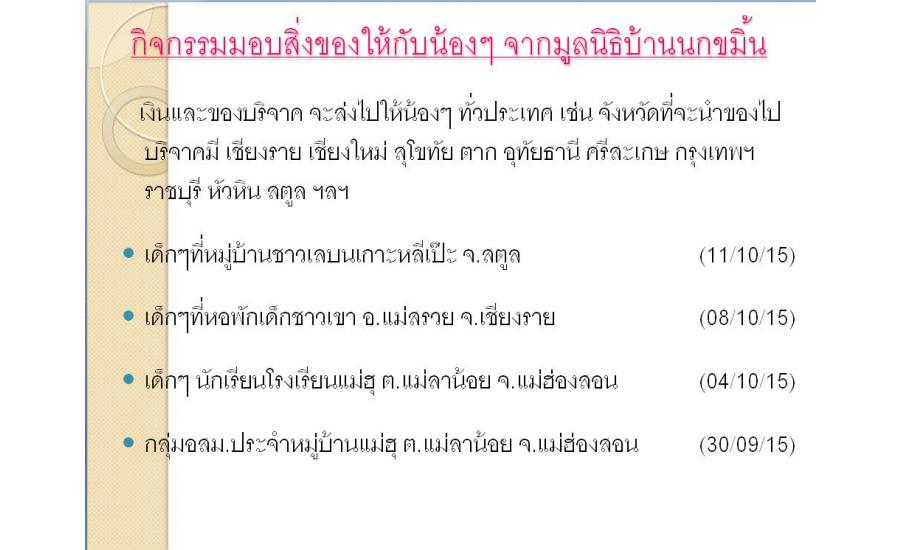 ในต้นเดือนตุลาคม ที่ผ่านมา ทีมผู้บริหารและกลุ่มพนังงาน SMC ได้เปิดโครงการประชาสัมพันธ์, สนับสนุนและช่วยเหลือมุลนิธิบ้านนกขมิ้น