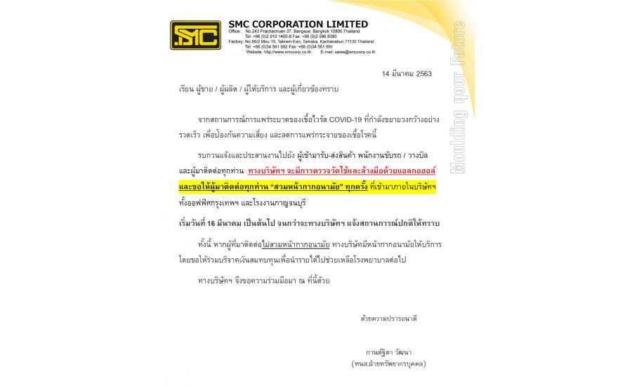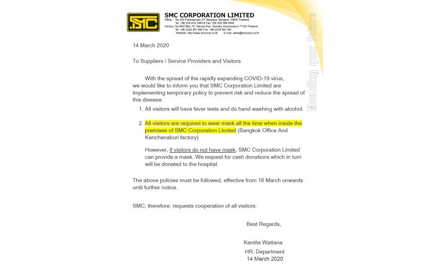 we would like to inform you that SMC Corporation Limited are implementing temporary policy to prevent risk and reduce the spread of this disease.